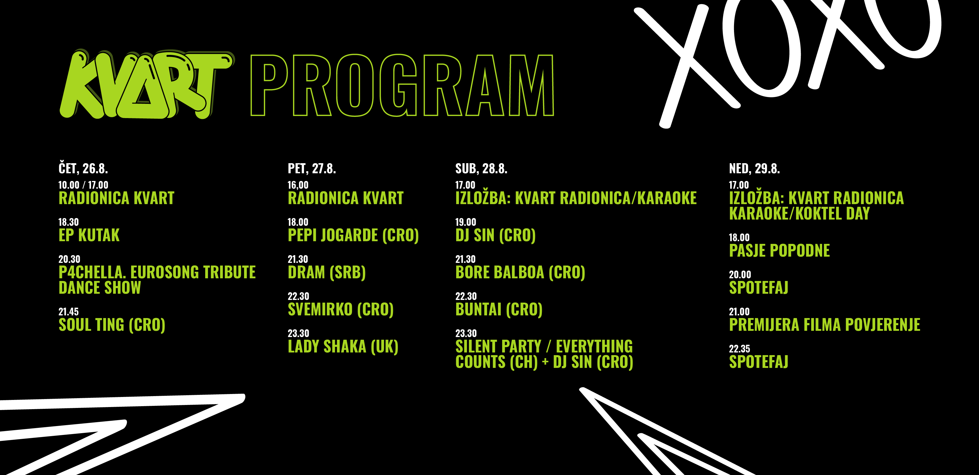 Na KVART stageu svirat će pop senzacija Svemirko, ponajbolji trap i hip-hop izvođači Buntai i Bore Balboa, dok će prvi put u Varaždinu gostovati beogradski synth pop bend dram. Publiku će rasplesavati i popularni hrvatski DJ-evi i DJ-ice Miss Moon iz pulskog ženskog kolektiva Soul Ting, otac mediteranskih ritmova na plesnom podiju Pepi Jogarde, uvijek odličan DJ Sin, švicarski DJ duo Everything Counts, a drito iz Londona (inače porijeklom iz Novog Zelanda) u KVART dolazi i Lady Shaka, multižanrosvka DJ-ica i umjetnica u čijim se (glazbenim i plesnim) ritmovima osjeti utjecaj pacifičke i afričke kulture, odnosno klupske underground scene Londona. Ovogodišnji noviteti u KVARTu su Karaoke powered by Alpha-M na kojima posjetitelji i posjetiteljice mogu pokazati svu raskoš pjevačkog (ne)talenta, ali i Silent party powered by Oprema koji će biti održan prvi put u Varaždinu!
