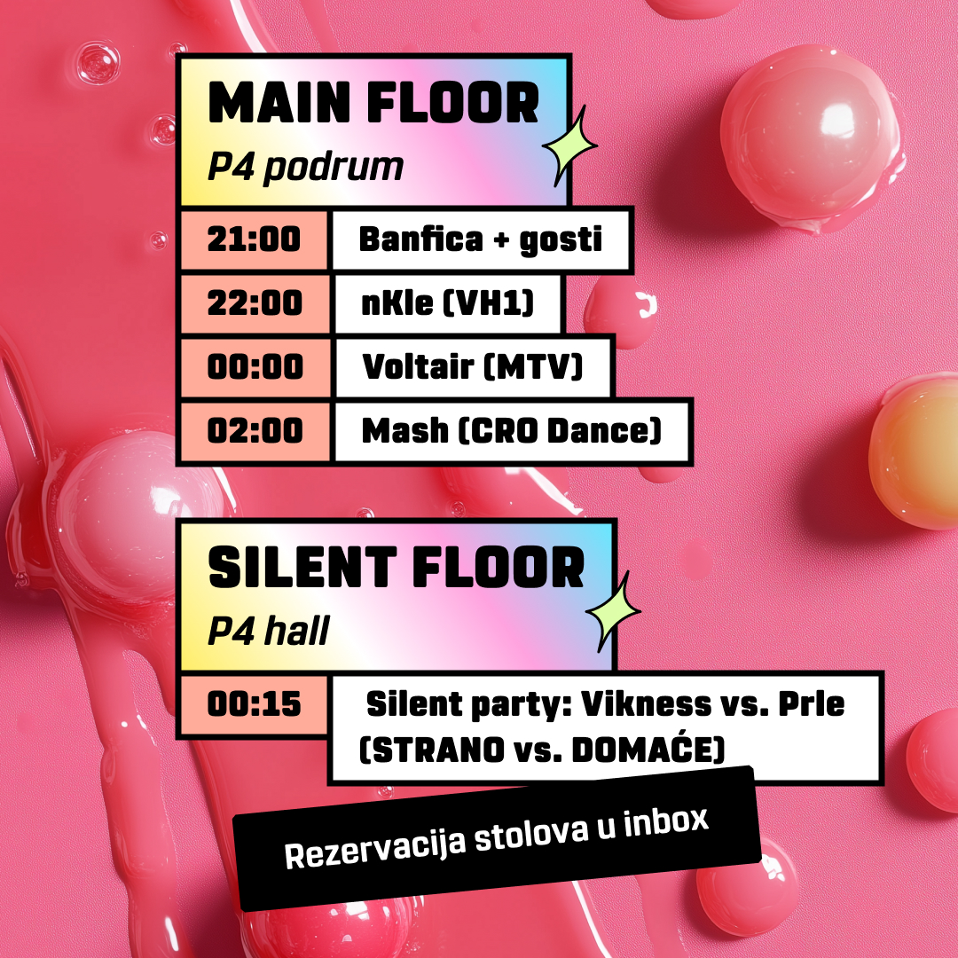 Za Doček u P4 i najluđu noć u godini pripremili smo 2 floora, 5 DJ-eva i koncert varaždinske drill zvijezde Banfice! Kako će to sve skupa izgledati? Vrata P4 otvaramo 31. prosinca u 20 sati i 30 minuta. U P4 podrumu od 21 sat kreće koncert Banfice i gostiju. Nakon koncerta, od 22 sata otvaramo plesni podij koji će zagrijavati 3 DJ-a! Prvi je nKle s VH1 pop/rock/indie/electro hitovima, zatim će atmosferu do usijanja dovesti Voltair s MTV set listom, dok će nas u Novu uvesti Mash s CRO dance pjesmama koje se pjevaju glasno i grleno. A iza ponoći, vatrometa po gradu, čestitarenja i kisseva za sreću u 2025., otvaramo drugi floor u Glluglu (kat iznad P4 podruma). Tamo će te dočekati P4 rezidenti i domaćini Vikness i Prle na silent partyju. Već znaš što na silentu s njima očekivati – domaći vs. strani hitovi.