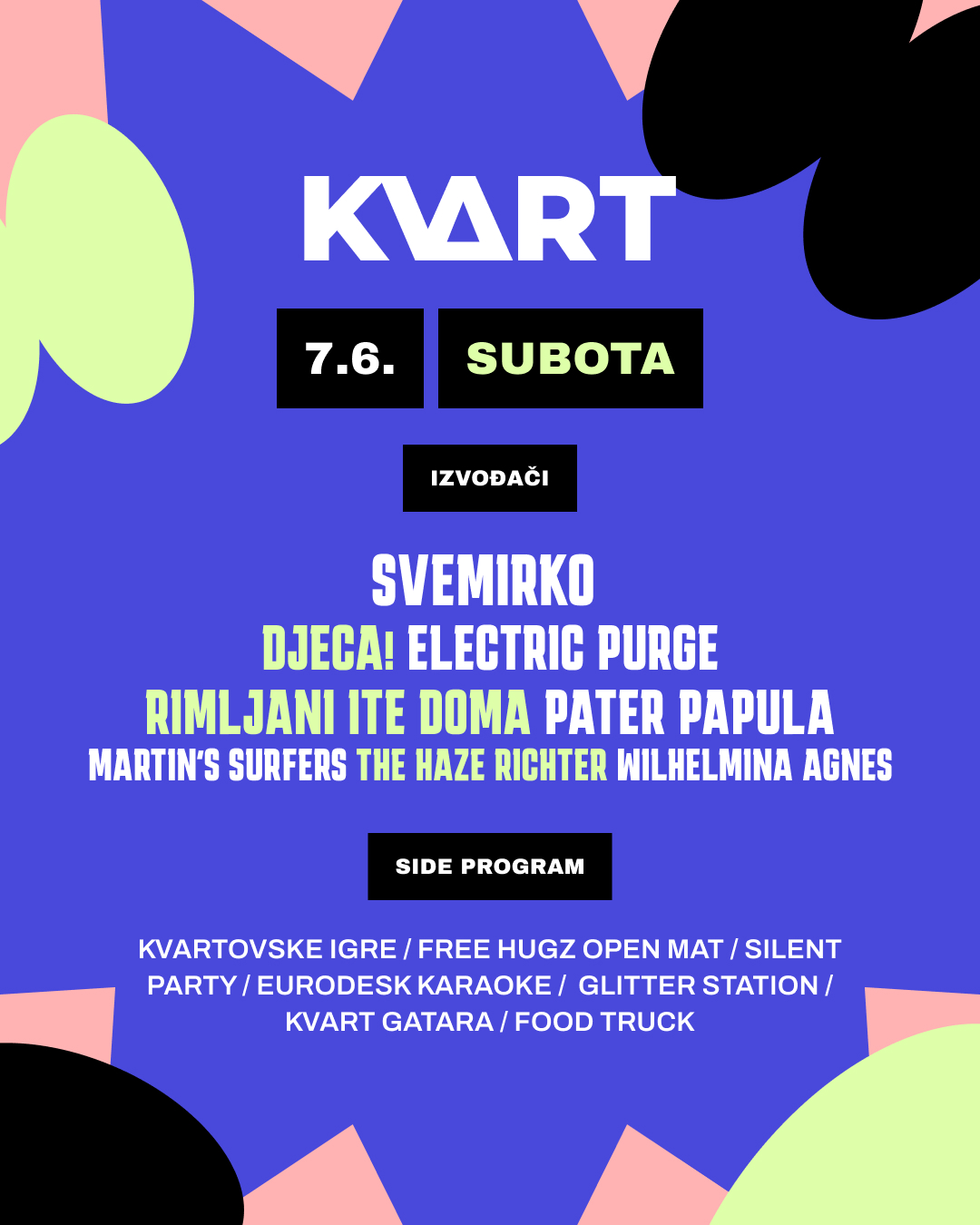 Side program: graffiti radionica, KVART battle, EP parlaonica, Glitter Station, KVART gatara, Food Truck