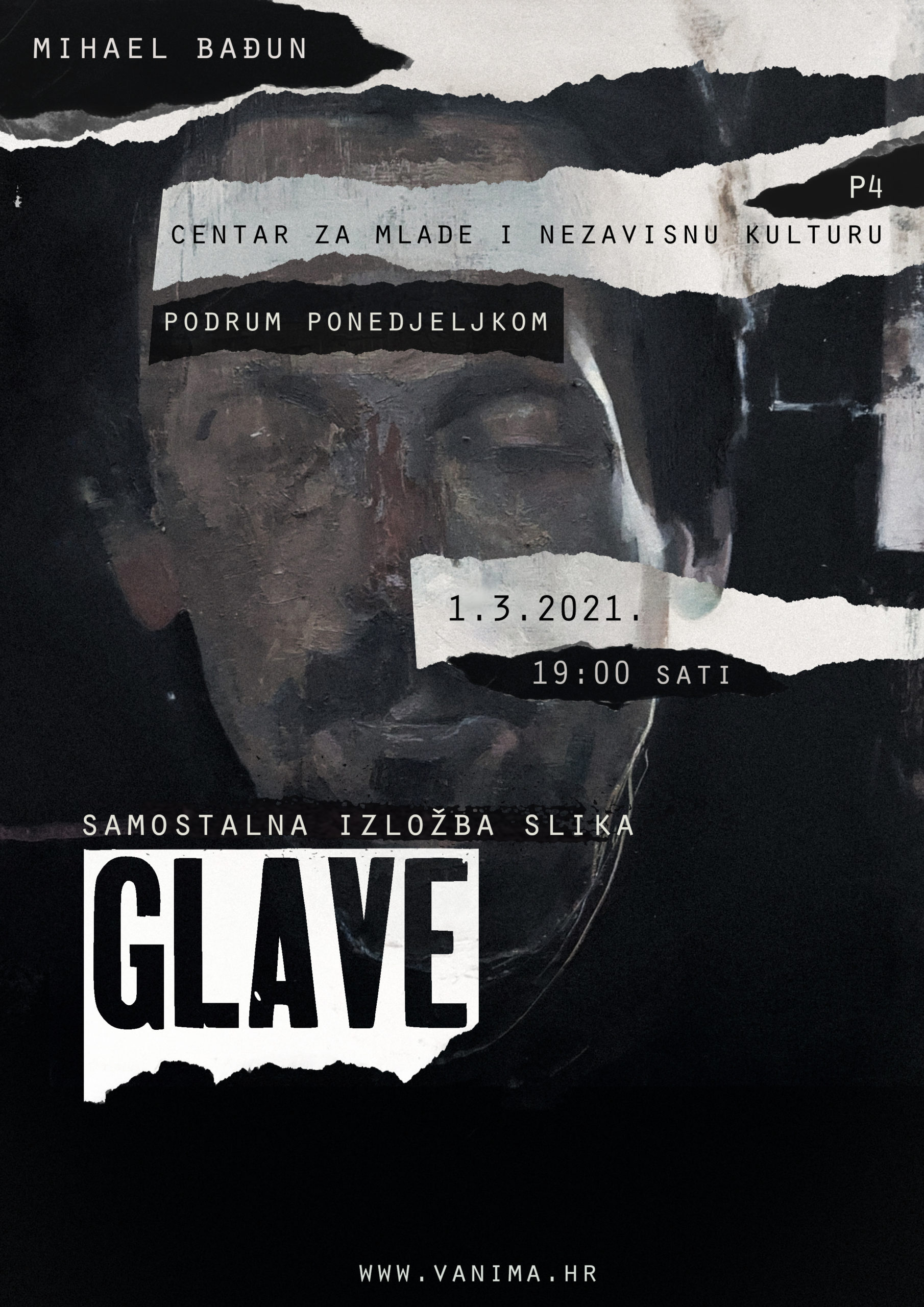 Samostalna izložba Mihaela Bađuna nazvana “Glave”, otvorena je u ponedjeljak, 1. ožujka u P4 – centru za mlade i nezavisnu kulturu u Varaždinu. Ovom je izložbom udruga Filmsko-kreativni studio VANIMA otvorila sezonu izlaganja u novoj godini, a time se nastavlja ciklus programa Podrum ponedjeljkom. Izložba je otvorena za javnost do 13. ožujka.