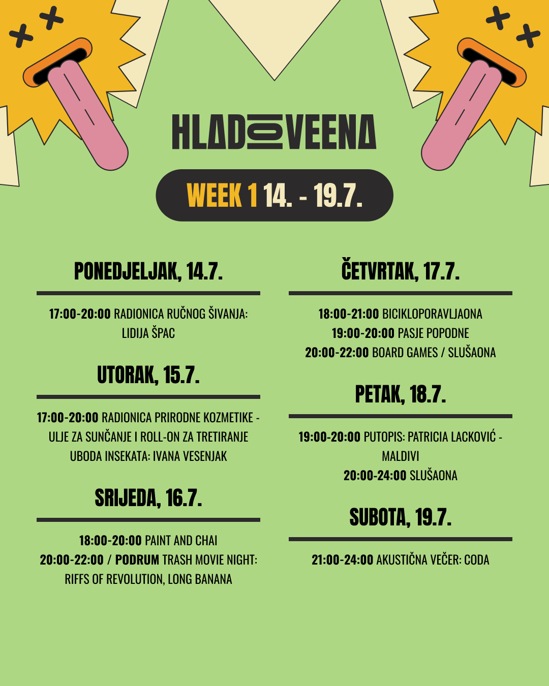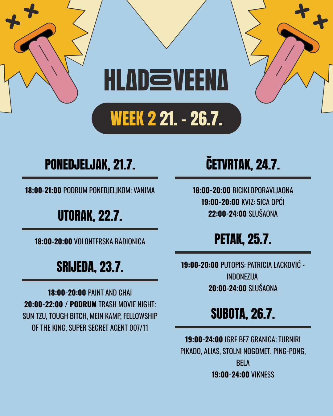 Vrijeme je za tvoj najdraži i najopušteniji ljetni program u P4! Hladoveena ide od 14. do 26. srpnja 2025., a ove smo godine organizirali za tebe programe, koncerte i (trash) filmske večeri. U nastavku pročitaj detalje o svim programima i prijavi se na vrijeme za turnire i radionice!
