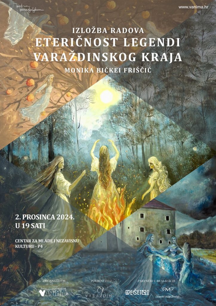 Riječ je o izložbi slika pod nazivom „Eteričnost legendi varaždinskog kraja“ kojom se predstavlja Monika Bičkei Friščić. Desetak ulja na platnu većih formata, izloženih u P4, podrumskom prostoru CZM u Preradovićevoj ulici u Varaždinu, rađenih u poetsko-snovitom, magično realističkom i nadrealističkom stilu, dio su novijeg autoričinog ciklusa u kojem Monika Bičkei prikazuje i ilustrira priče i legende iz prošlosti vezane uz pojedine arheološke lokalitete u Varaždinskoj županiji. Vještice u Beli, Vražji stolček, Črne Mlake, Vatrenjaci, Trakošćanski zmaj i Stepenice u šumi. To je tek dio legendi koje u našoj neposrednoj okolini zahvaljujući predaji žive stoljećima, pa i